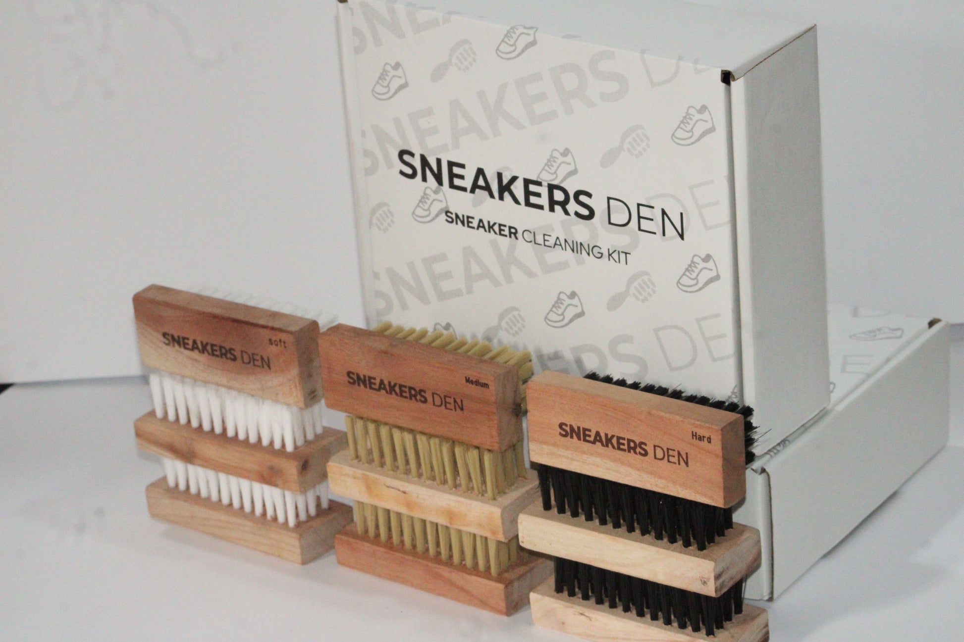 Maintain your sneakers with precision using the SneakersDen Sneaker Cleaning Brush Kit. This set includes three brushes—soft, medium, and hard bristles—designed for thorough cleaning of various materials and stubborn dirt. The soft brush protects delicate fabrics, the medium brush tackles everyday grime, and the hard brush removes tough stains and scuffs, ensuring your sneakers look pristine without damage. Ideal for sneaker enthusiasts seeking expert care and long-lasting shoe freshness.